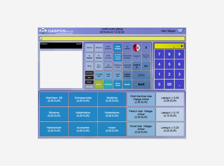 Herzstück der CASPOStouch-Kasse ist das auf Touchscreen basierende Kassenprogramm. Intuitive Bedienung ermöglichen Ihne und Ihren Mitarbeitern ein einfaches, reibungslosens Kassieren. Zahlreiche, praktische Module helfen Ihnen, die Administration in Ihrem Betrieb auf ein Minimum zu reduzieren und nach kurzer Einarbeitungszeit, die täglichen Arbeiten schnell und effektiv zu erledigen.